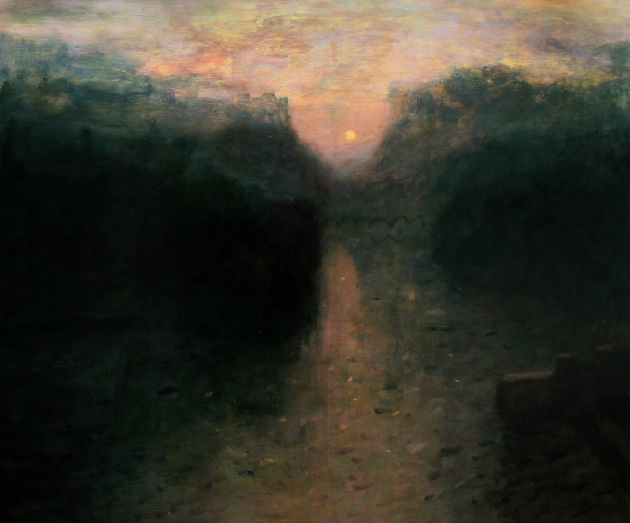 My paintings are rooted in the borderlands of South Shropshire — ancient woodland, historical conflict, literary resonance. What began as direct encounter with a place has become something else: an imagined territory. The Mortimer name runs through the work as both location and myth. There is no Mortimer Lake.